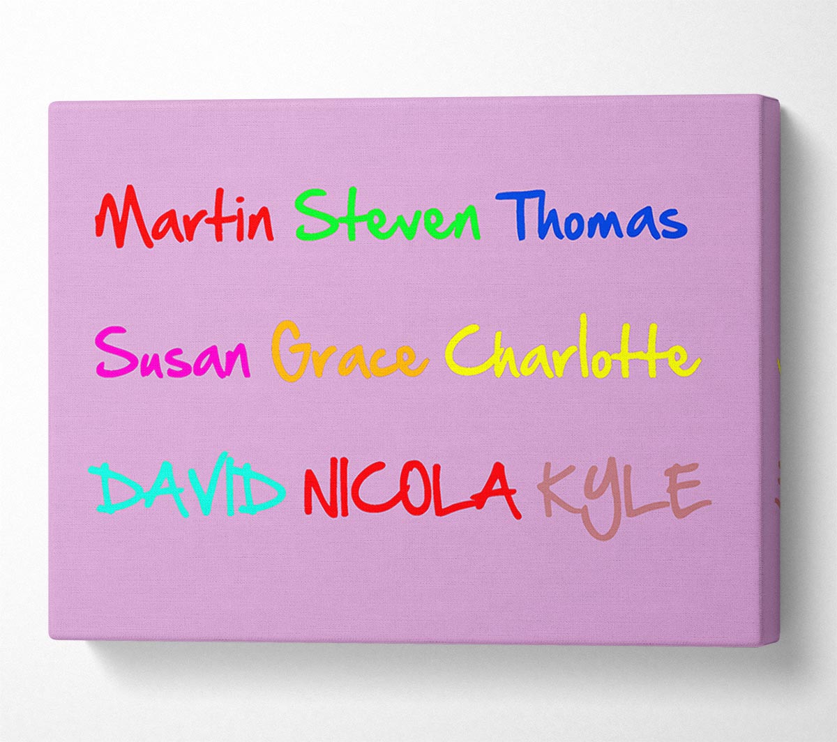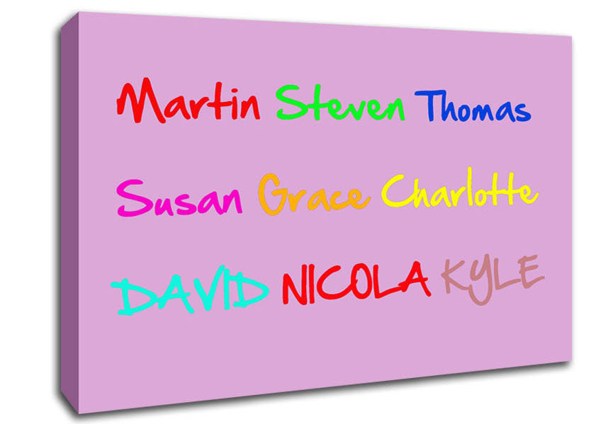 Your Name In A Choice Of Colours Pink Canvas Print handmade in the UK. Stretched over a 2 inch thick wooden box frame, ready to hang on your wall.