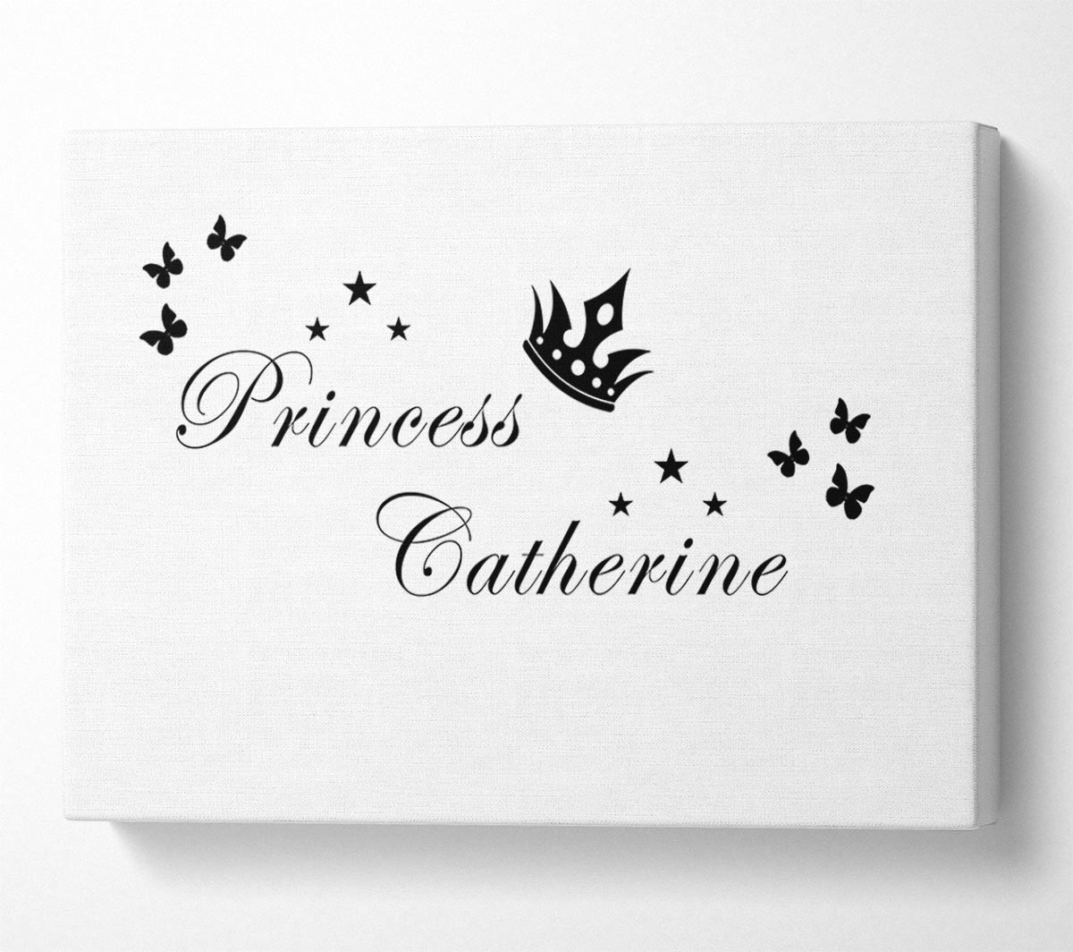 Your Own Name Princess 2 White Canvas Print handmade in the UK. Stretched over a 2 inch thick wooden box frame, ready to hang on your wall.