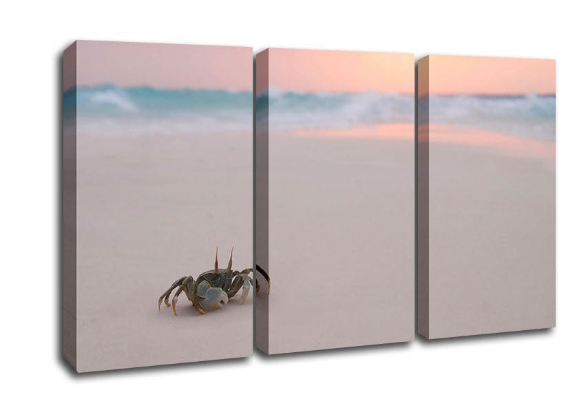 Crab On Beach 3 Panel Canvas Print handmade in the UK. Stretched over a 2 inch thick wooden box frame, ready to hang on your wall.