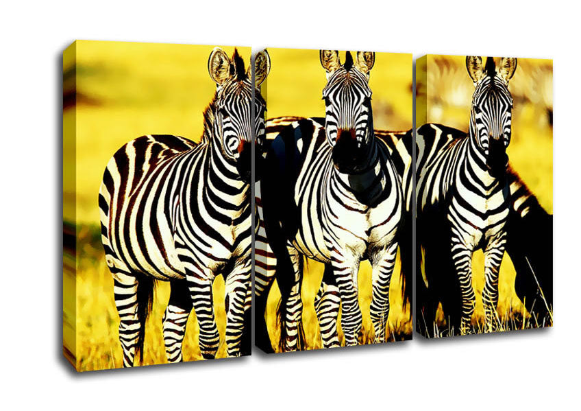 Curious Zebras 3 Panel Canvas Print handmade in the UK. Stretched over a 2 inch thick wooden box frame, ready to hang on your wall.