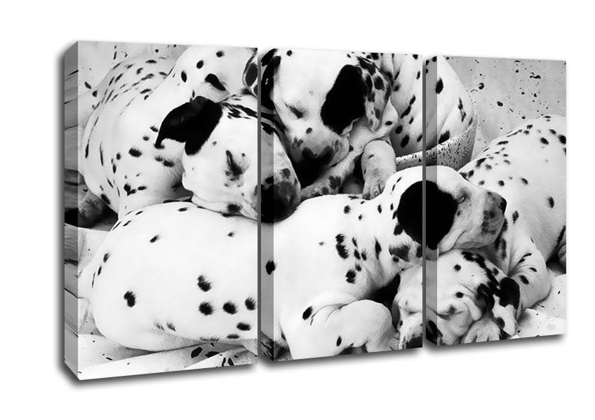 Dalmatian Puppies In Dreamland 3 Panel Canvas Print handmade in the UK. Stretched over a 2 inch thick wooden box frame, ready to hang on your wall.