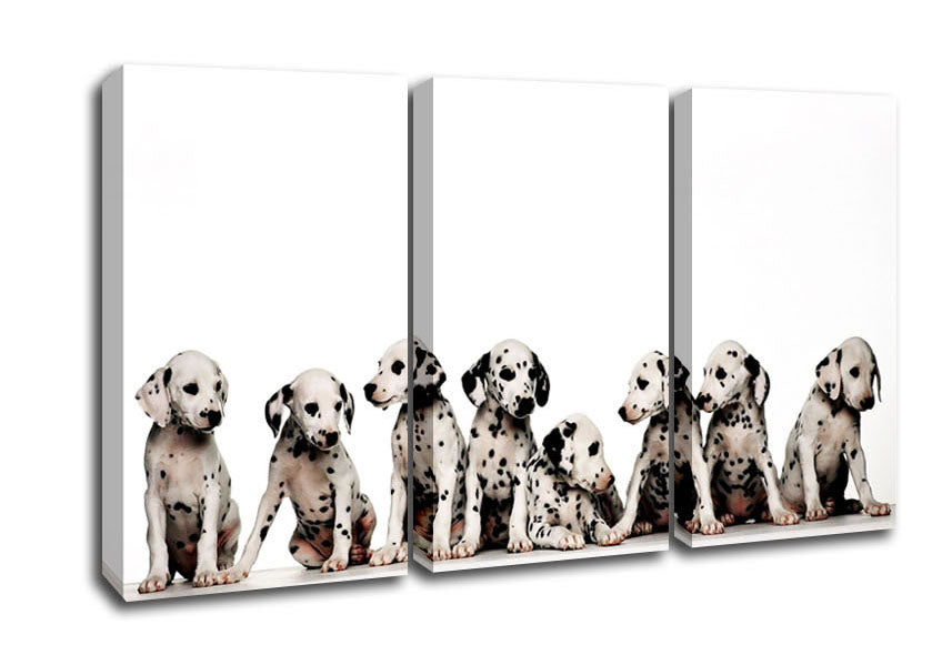 Dalmatian Puppy Fun 3 Panel Canvas Print handmade in the UK. Stretched over a 2 inch thick wooden box frame, ready to hang on your wall.