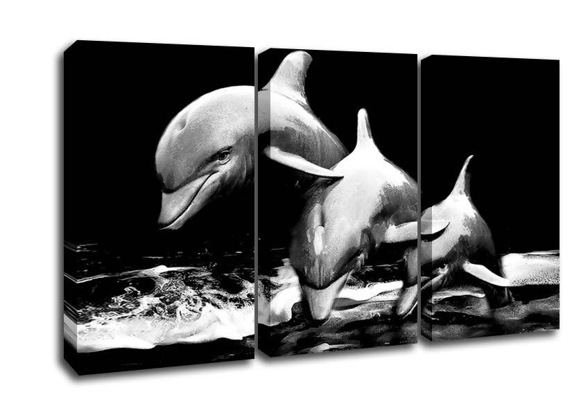 Dolphins 3 Panel Canvas Print handmade in the UK. Stretched over a 2 inch thick wooden box frame, ready to hang on your wall.