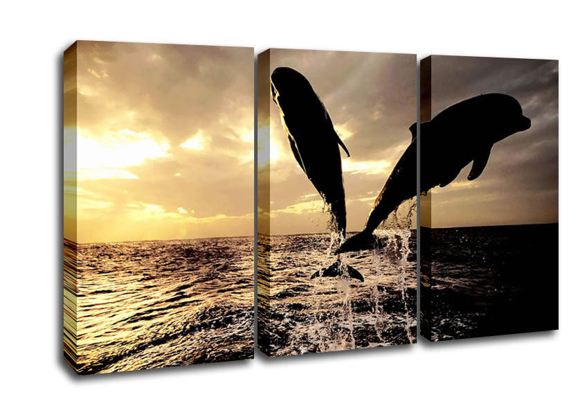 Double Dolphin Jump 3 Panel Canvas Print handmade in the UK. Stretched over a 2 inch thick wooden box frame, ready to hang on your wall.