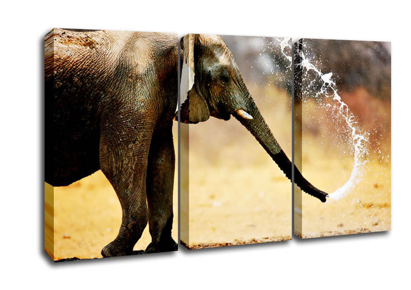Elephant Bath 3 Panel Canvas Print handmade in the UK. Stretched over a 2 inch thick wooden box frame, ready to hang on your wall.