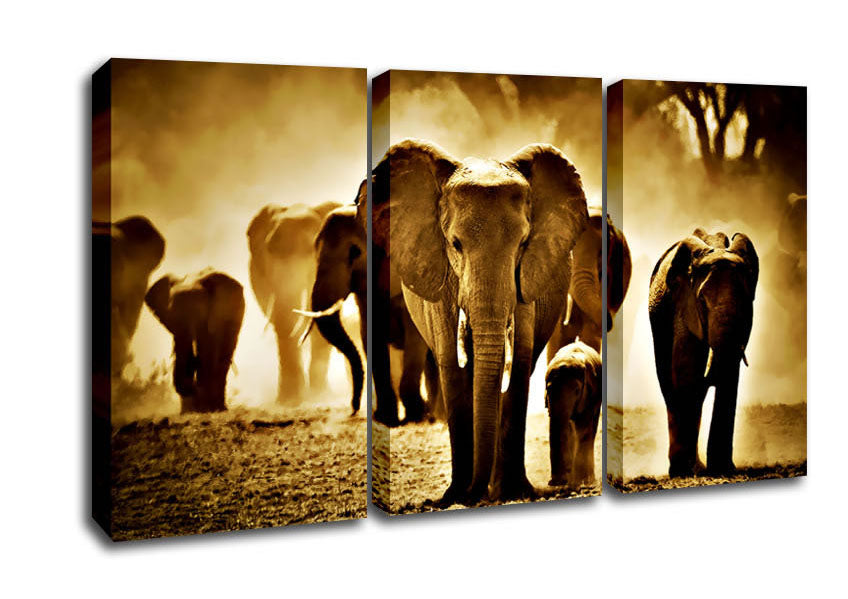 Elephant Stampede 3 Panel Canvas Print handmade in the UK. Stretched over a 2 inch thick wooden box frame, ready to hang on your wall.