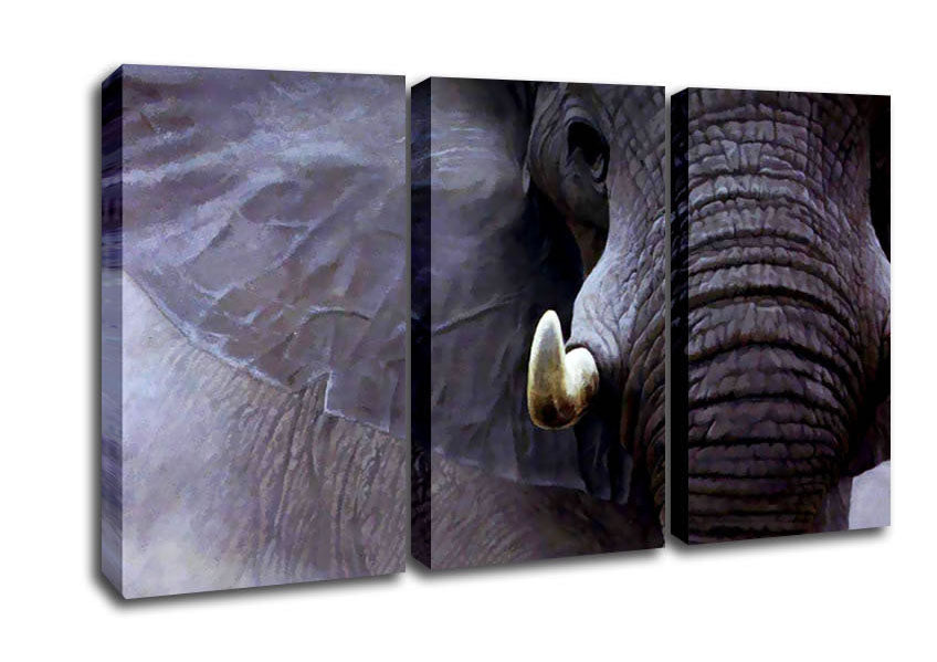 Elephant Stare 3 Panel Canvas Print handmade in the UK. Stretched over a 2 inch thick wooden box frame, ready to hang on your wall.