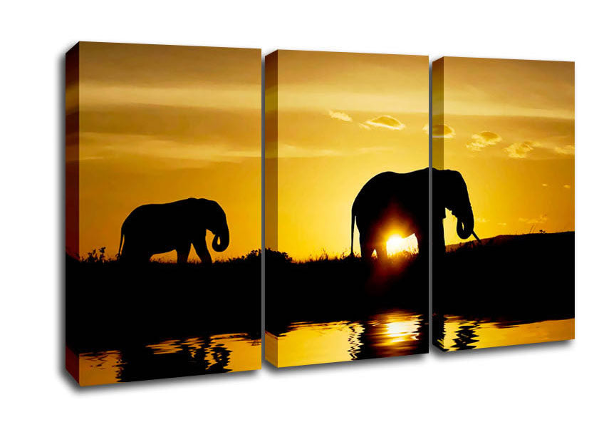 Elephants Watering Hole 3 Panel Canvas Print handmade in the UK. Stretched over a 2 inch thick wooden box frame, ready to hang on your wall.