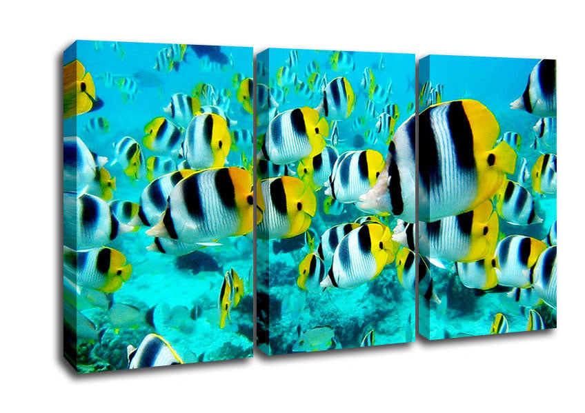 Fish Fury 3 Panel Canvas Print handmade in the UK. Stretched over a 2 inch thick wooden box frame, ready to hang on your wall.