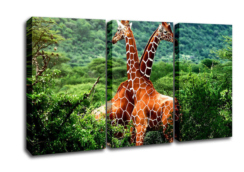 Giraffes Africa 3 Panel Canvas Print handmade in the UK. Stretched over a 2 inch thick wooden box frame, ready to hang on your wall.