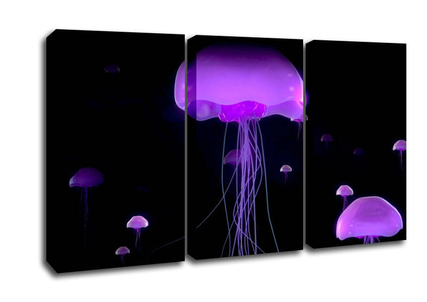 Jellyfish Lights Up The Ocean 3 Panel Canvas Print handmade in the UK. Stretched over a 2 inch thick wooden box frame, ready to hang on your wall.