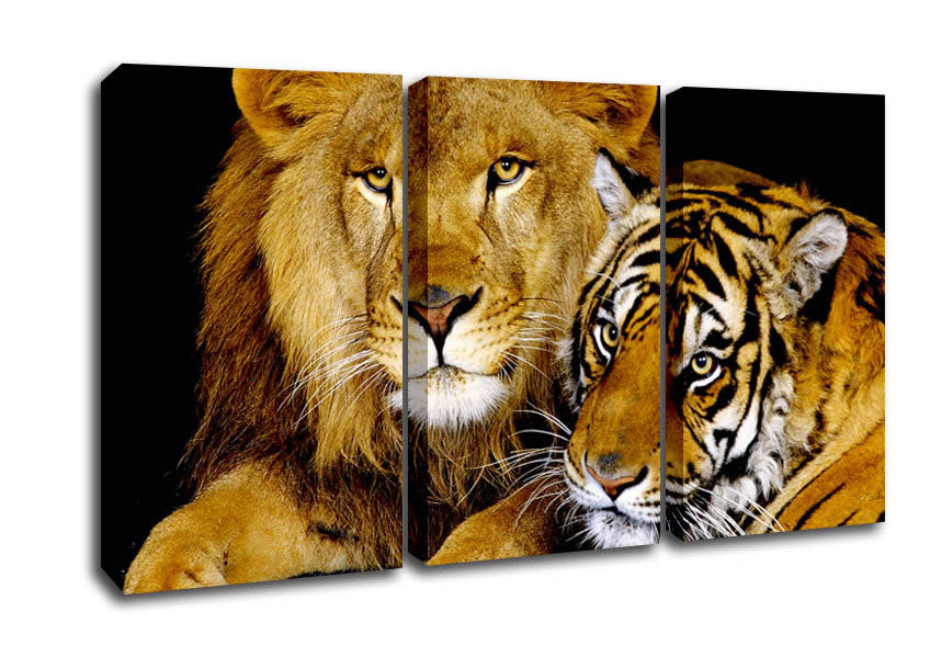 Lion Tiger Love 3 Panel Canvas Print handmade in the UK. Stretched over a 2 inch thick wooden box frame, ready to hang on your wall.