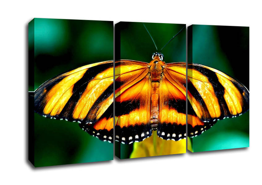 Orange And Black Butterfly 3 Panel Canvas Print handmade in the UK. Stretched over a 2 inch thick wooden box frame, ready to hang on your wall.