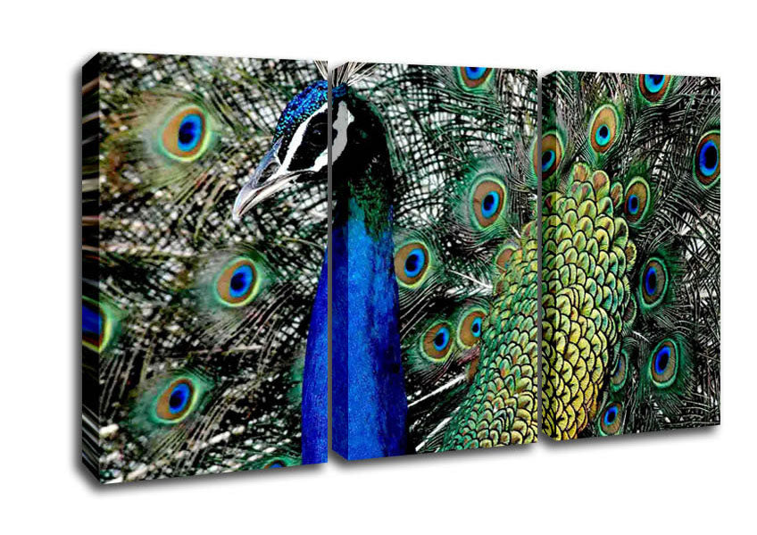 Peacock Stare 3 Panel Canvas Print handmade in the UK. Stretched over a 2 inch thick wooden box frame, ready to hang on your wall.