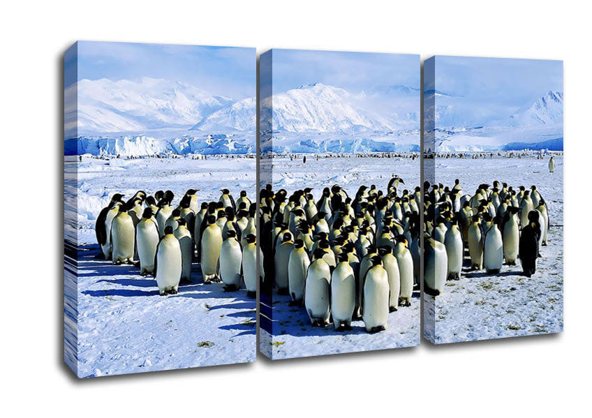 Penguin Cuddle 3 Panel Canvas Print handmade in the UK. Stretched over a 2 inch thick wooden box frame, ready to hang on your wall.