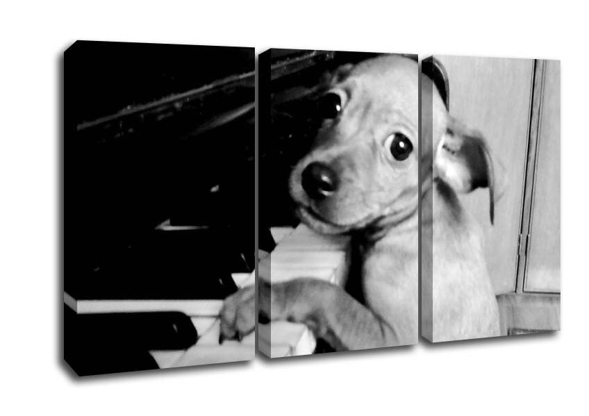 Piano Pup 3 Panel Canvas Print handmade in the UK. Stretched over a 2 inch thick wooden box frame, ready to hang on your wall.