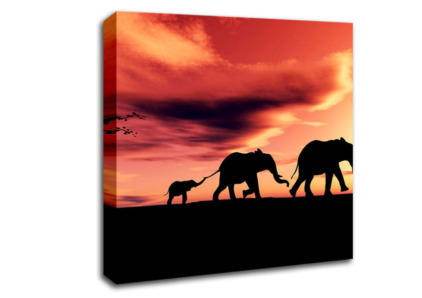 Elephant Family Sunset Square Canvas Print handmade in the UK. Stretched over a 2 inch thick wooden box frame, ready to hang on your wall.