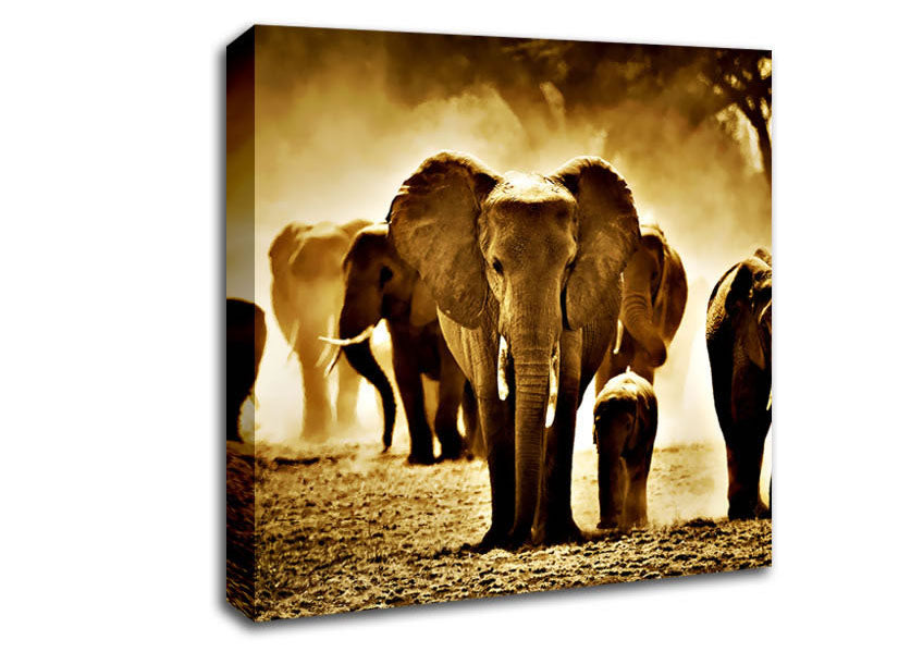 Elephant Stampede Square Canvas Print handmade in the UK. Stretched over a 2 inch thick wooden box frame, ready to hang on your wall.