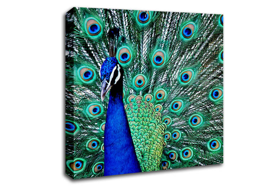 Peacock Glory Square Canvas Print handmade in the UK. Stretched over a 2 inch thick wooden box frame, ready to hang on your wall.