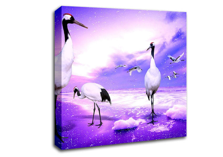 Red Crowned Cranes Japan Square Canvas Print handmade in the UK. Stretched over a 2 inch thick wooden box frame, ready to hang on your wall.