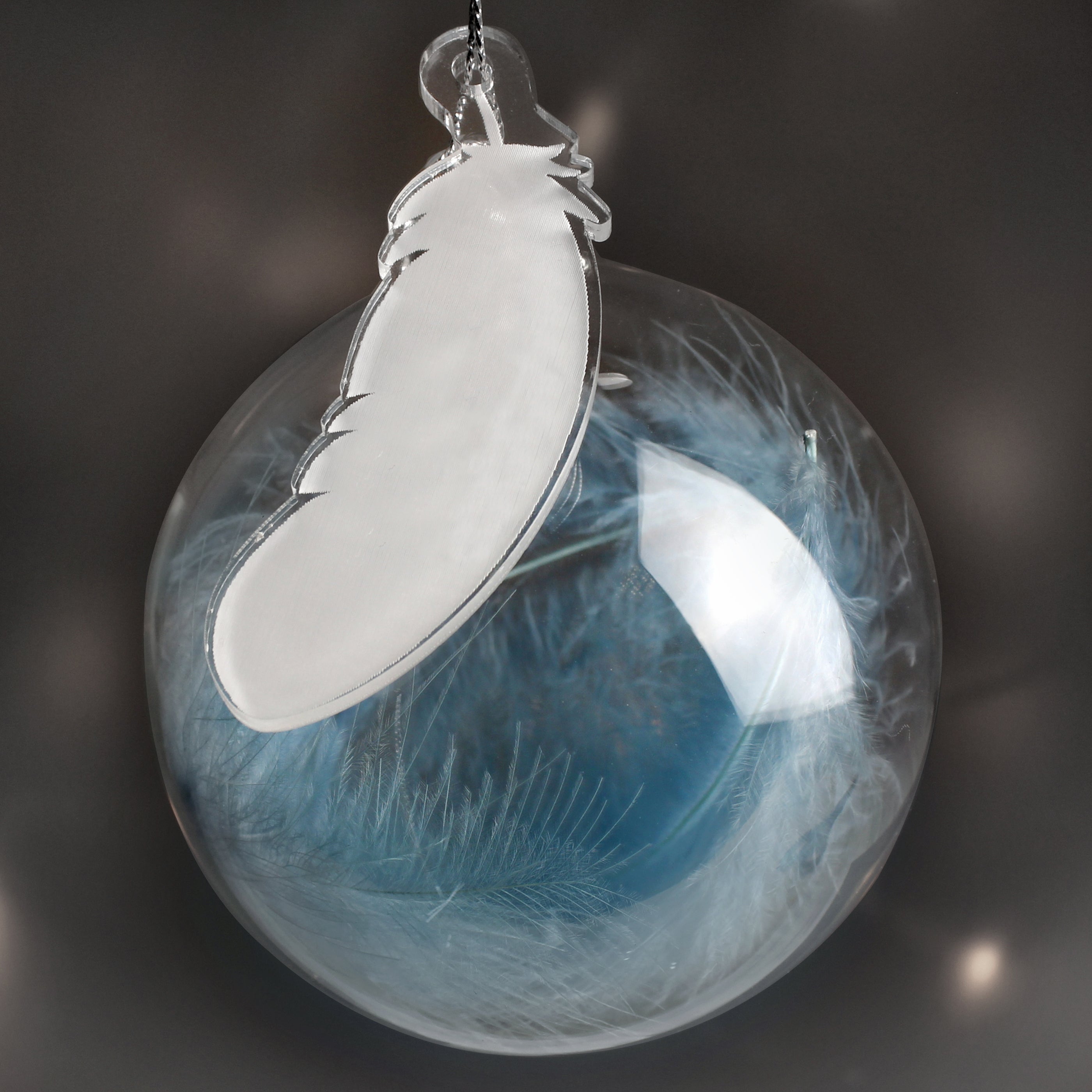 This Personalised Blue Feather Glass Bauble with Feather Tag will make a stunning addition to the Christmas tree. The Acrylic feather tag can be personalised with the following, Line 1 is for a name - 11 characters - please DO NOT USE UPPERCASE Line 2 is for a date only. e.g. - 1960-2019 or 10.02.1998 - putting anything other than a date could lead to poor personalisation Each glass bauble is filled with a delicate blue feather, which will look great hung on any Christmas tree! Please note these are handmade so there may be some slight imperfections such as small water marks due to the manufacturing process. Please ensure that the clear protective film has been removed from the acrylic prior to use. Ideal for Christmas, Memorial
