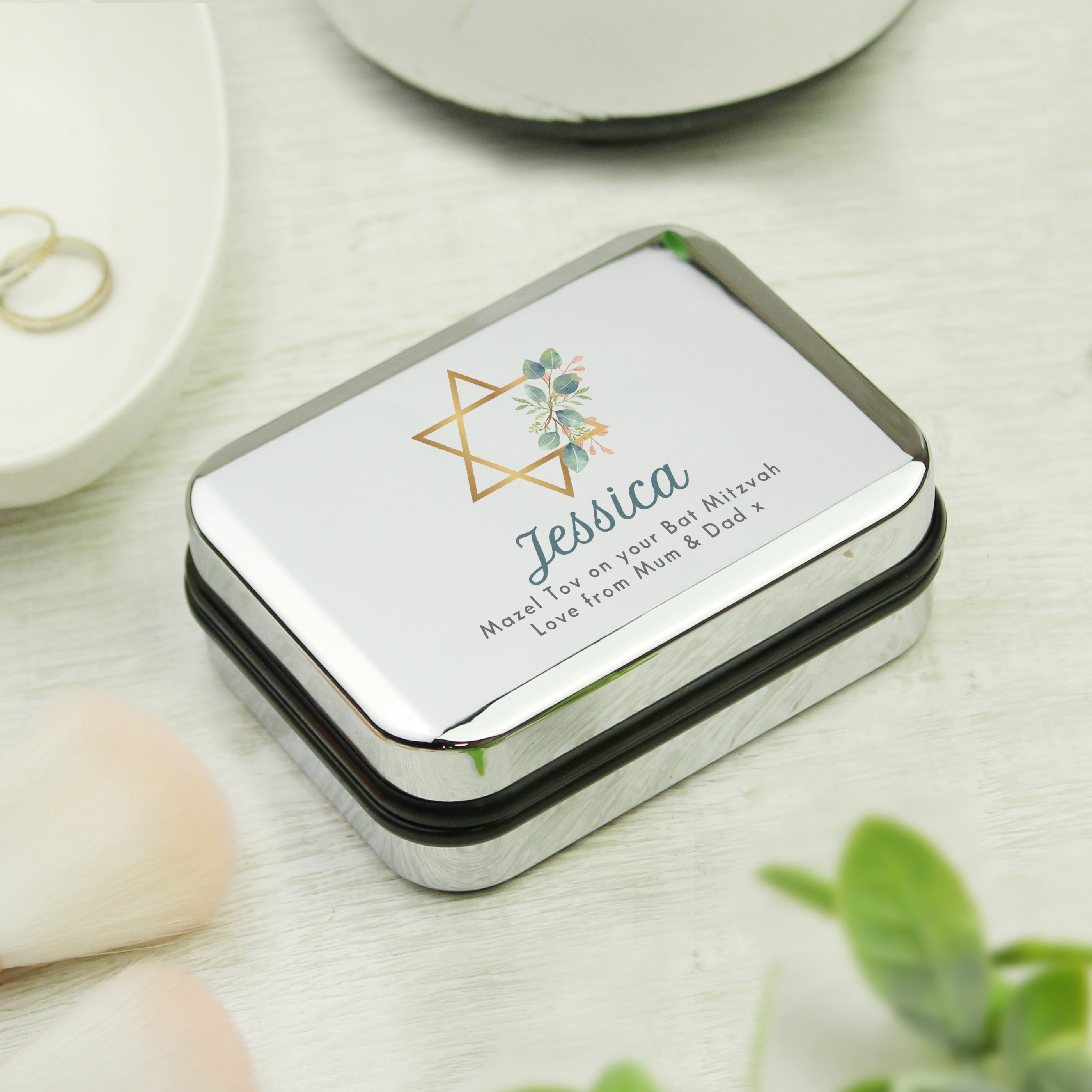 Celebrate this significant milestone with our Personalised Bat Mitzvah Chrome Necklace Gift Box, a timeless keepsake that's as unique as the occasion itself. Crafted from high-quality chrome, this necklace box exudes elegance and durability, ensuring it remains a cherished symbol for years to come. Serving as a meaningful reminder of the journey to adulthood and the spiritual growth achieved during this special time. Personalise this pendant box with up to three lines of text, as below Line 1- 25 characters Line 2 - 30 characters Line 3 - 30 characters Please note, all personalisation is case sensitive and will appear as entered. Please CLICK HERE to see the full range Perfect for Bar Mitzvah, Bat Mitzvah