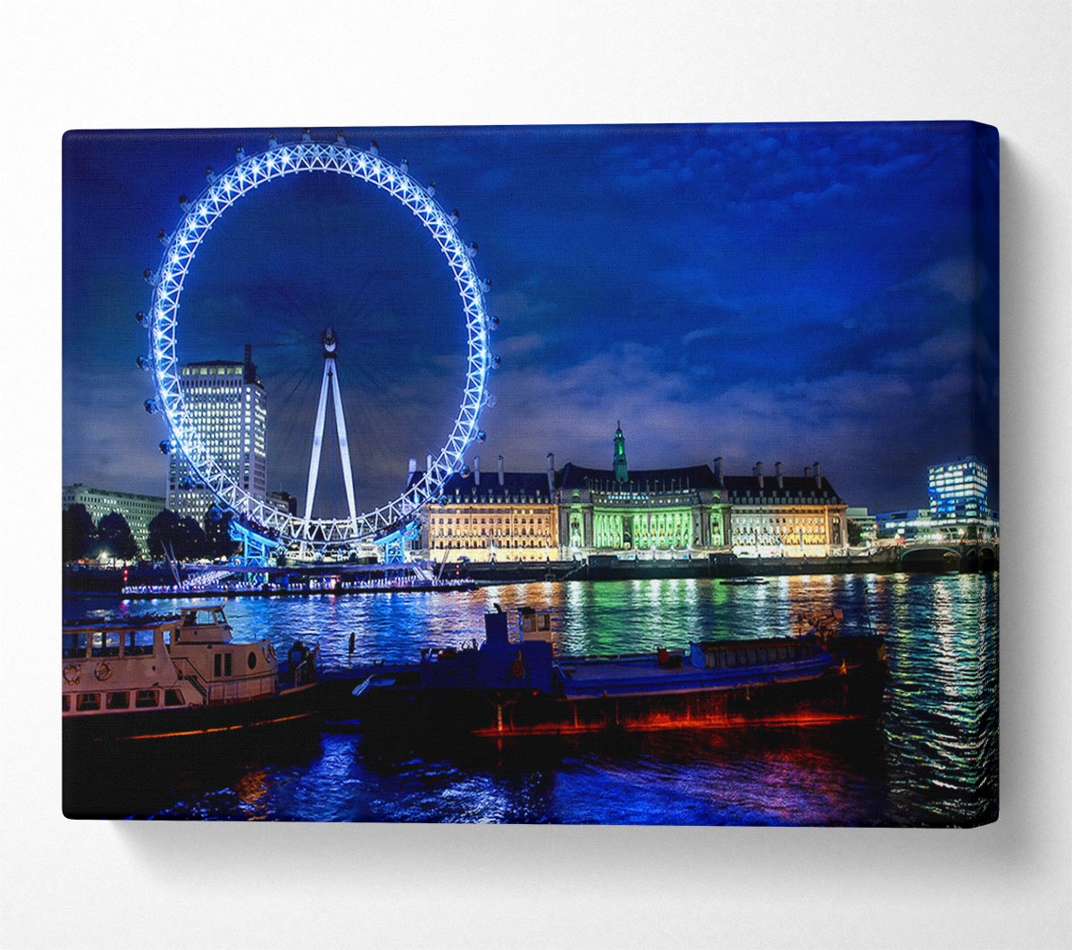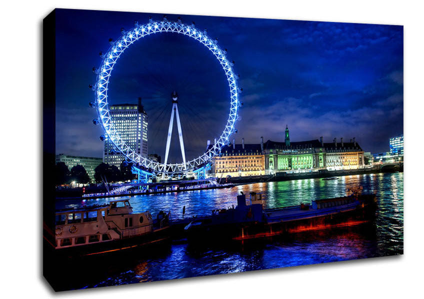 The London Eye At Night Canvas Print handmade in the UK. Stretched over a 2 inch thick wooden box frame, ready to hang on your wall.